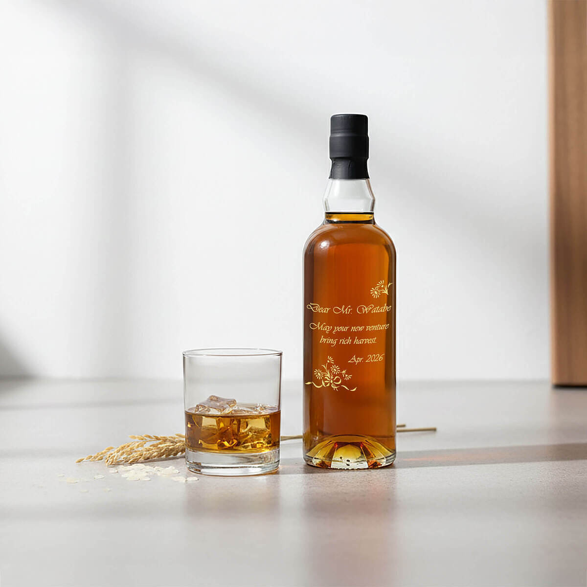 ワインや焼酎、日本酒などお酒のボトルにメッセージや名前・日付をレリーフして、記念に残るボトルを創りました。レリーフ部分はゴールド/シルバーのカラーリングで、さらにインパクトある仕上がり!