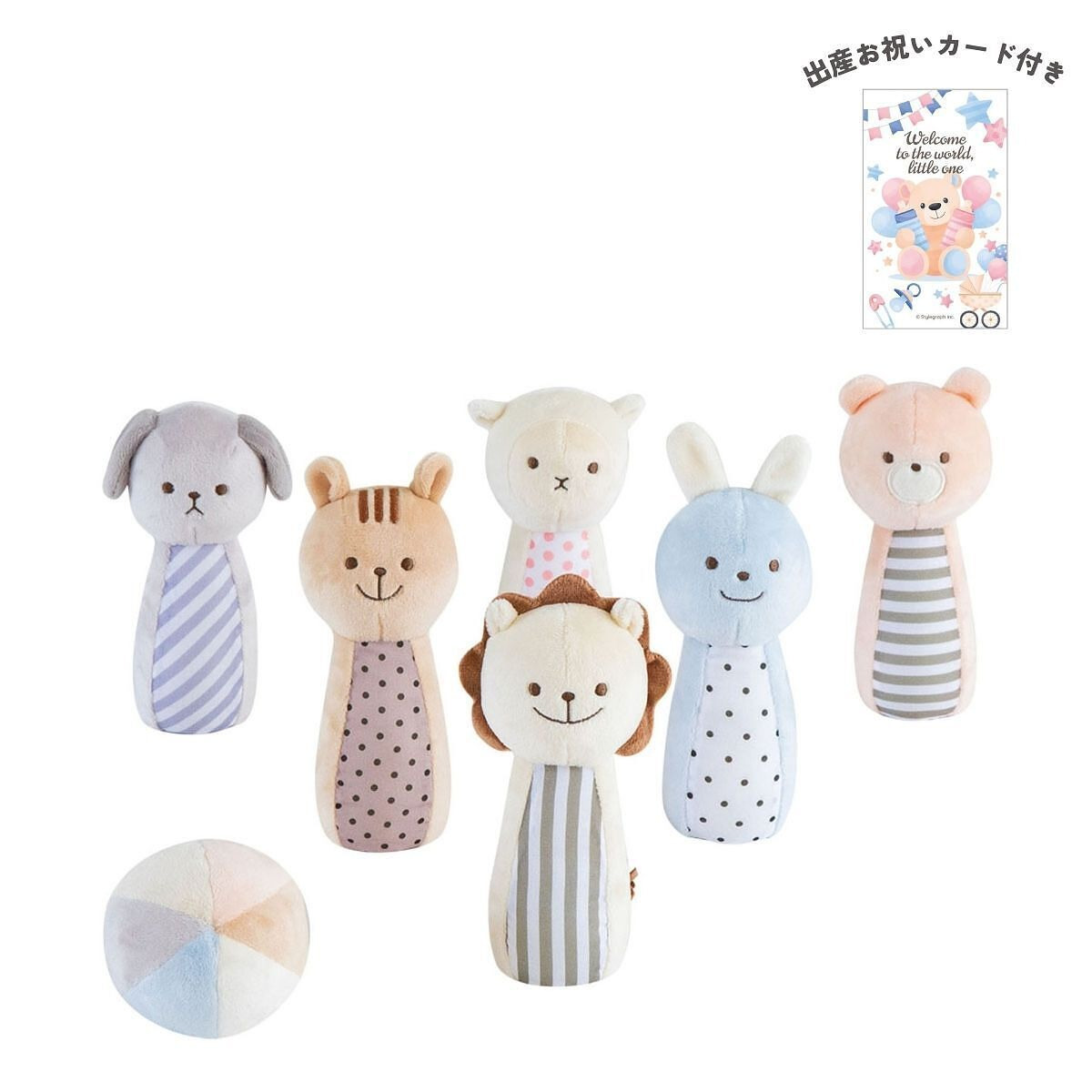 ボールを転がしてピンを倒すと、中の鈴が優しく鳴ります。「狙ってボールを投げる→ピンにあたる→ピンが倒れる」といった流れで、集中力を養います。ファーストトイやご出産祝いにおすすめです。