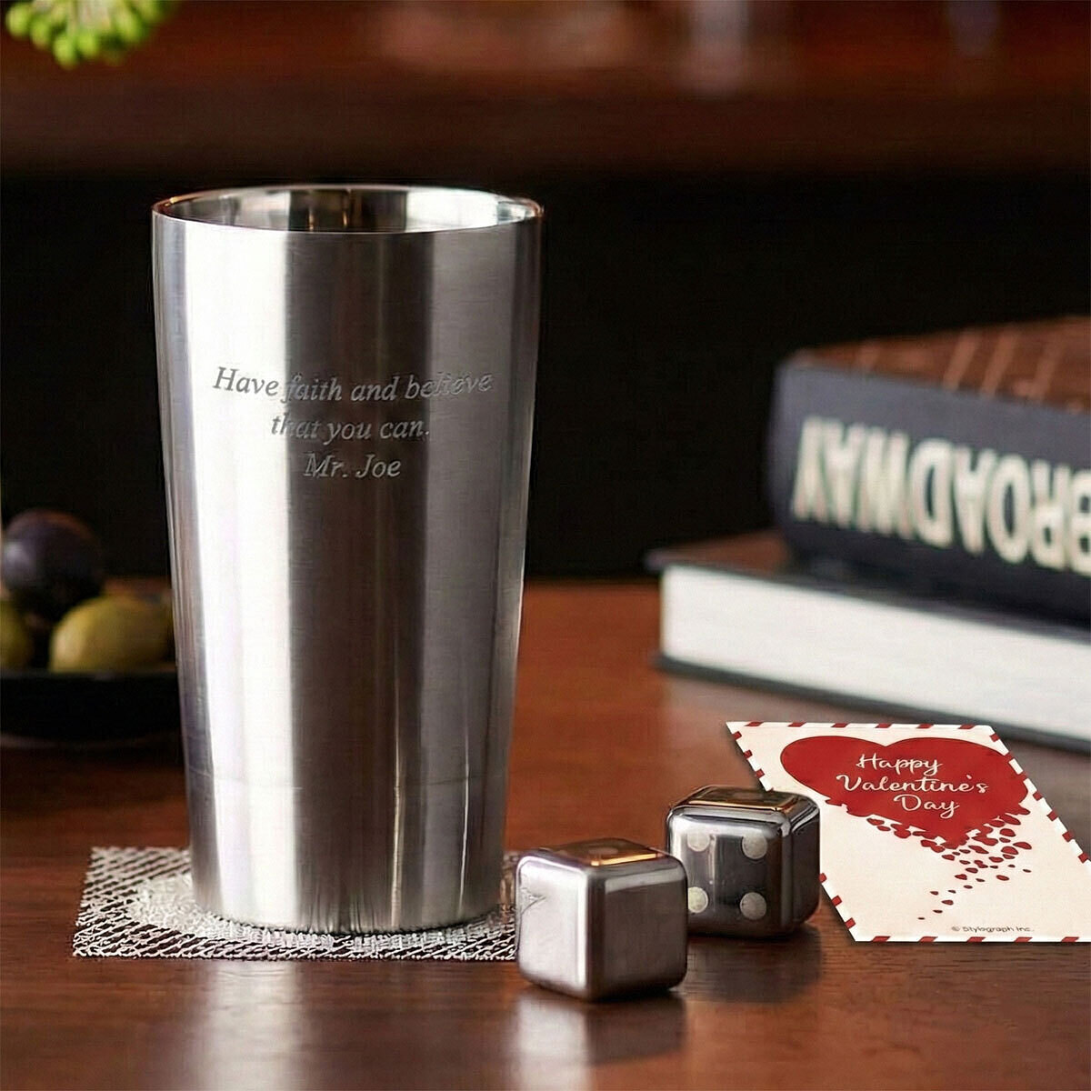 2重構造で、保温保冷機能に優れたステンレスカップ、冷凍庫で冷やして氷の代わりとして使えるステンレス製アイスキューブ、マドラーとコースターのセットです。