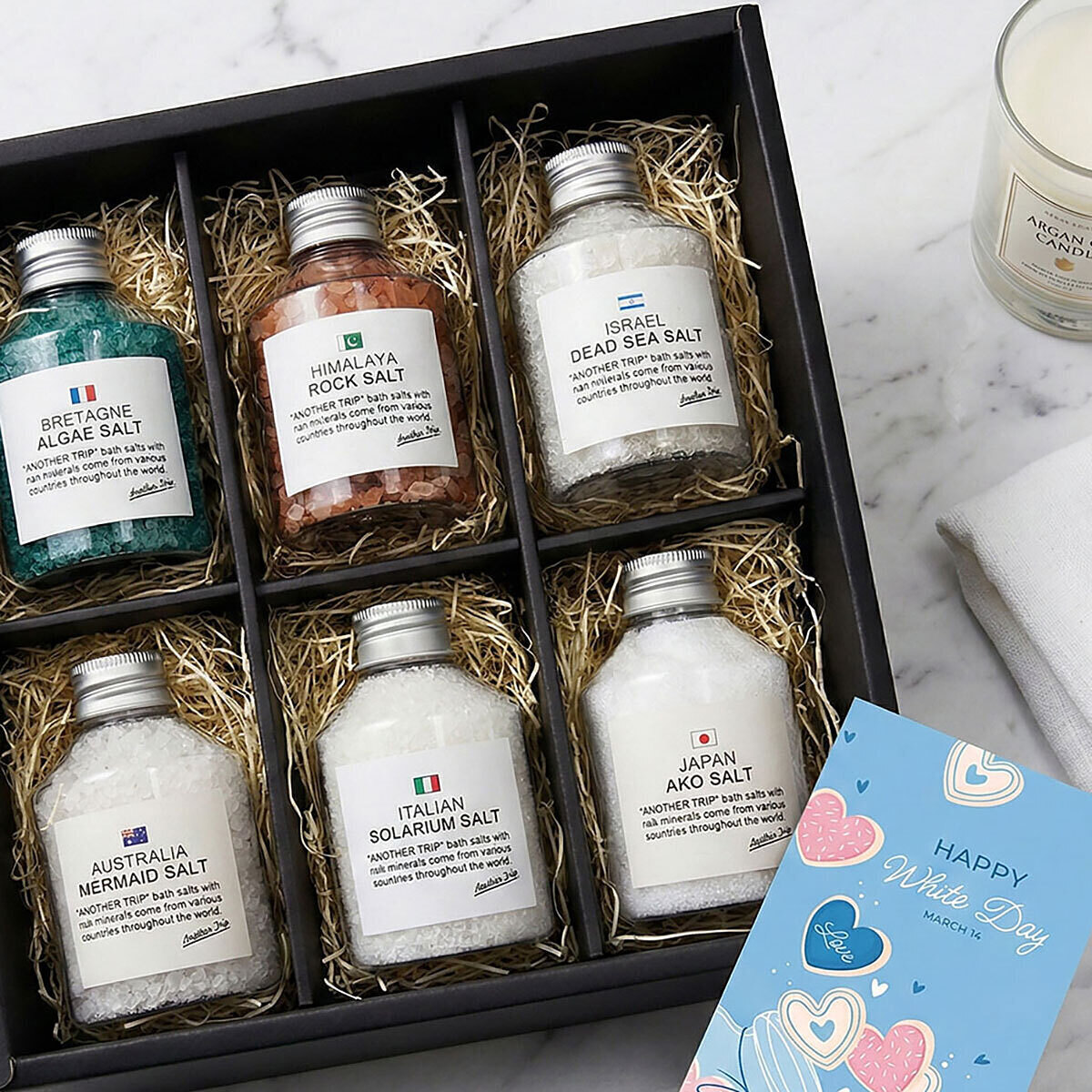 世界中から厳選したバスソルトを詰め合わせた「アナザートリップ NA CLAVEL(クラヴェル)」。CLAVEL 6(クラヴェル シックス)は、アナザートリップ NA の中でも特に人気の3種類に、粒のサイズが違う白く輝くソルト3種を加えた6種をセットしました。大切な方へ贈りたい、大自然の恵みと心安らかな時間…。各国の自然の恵みそのままに、贅沢なバスタイムをお届けします。