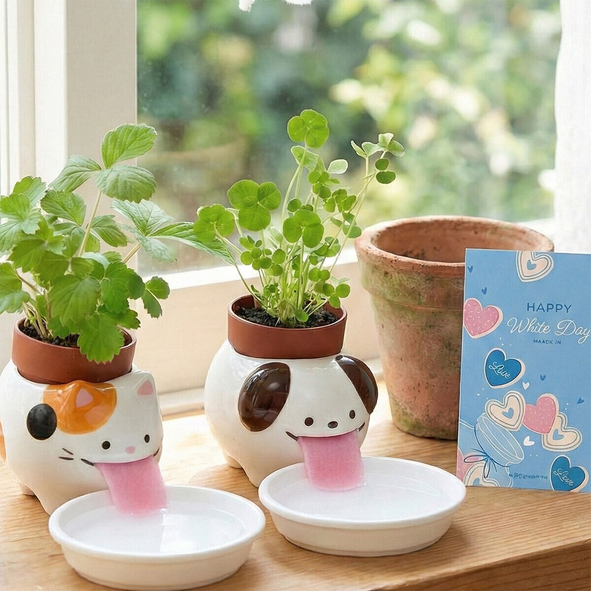 ペロペロとお水を飲んでいる姿が愛らしい栽培キットです。飲んだお水が背中のポットへ行き渡り植物がスクスクと育ちます。付属の水飲みトレイに水がなくなったら、忘れずお水をあげて「ペロポン」と植物を育ててね。