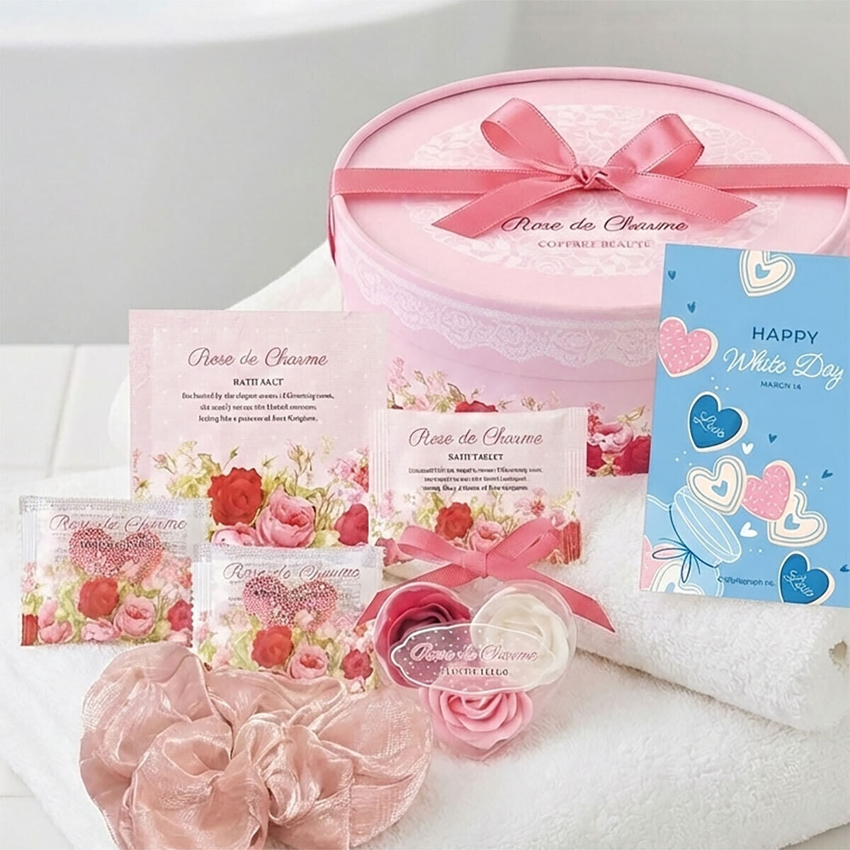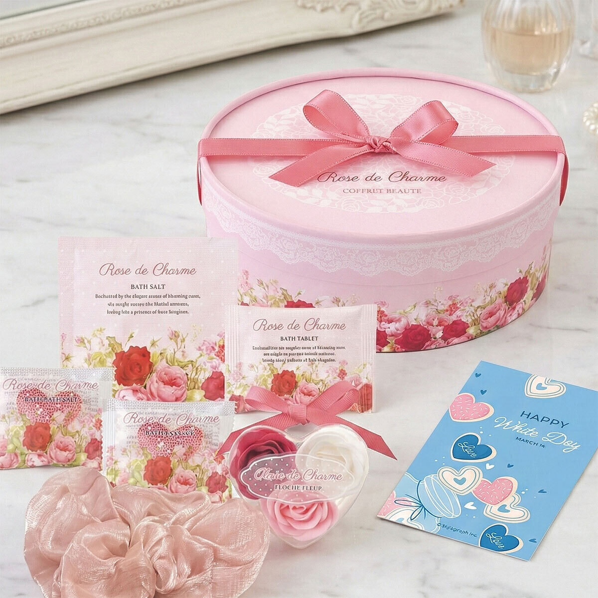 だ円形のラウンドボックスのギフトセット。7回分の入浴料とローズ色の大きめのシュシュが入った、心も身体も美しくなりそうなビューティセットです。大切な方へのプレゼントや自分へのご褒美に。ラウンドボックスは小物入れとしても使えます。