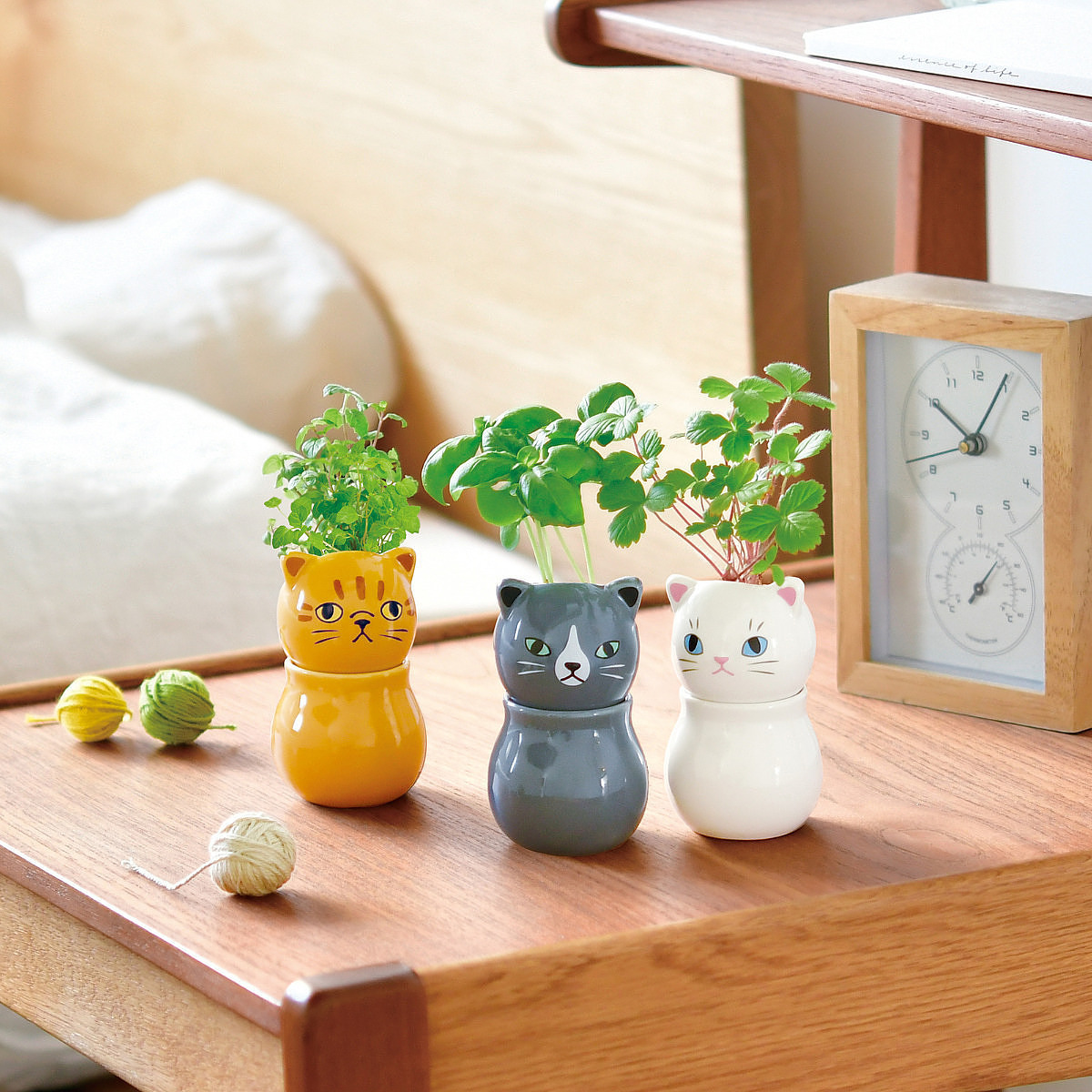 猫たちがコロンとお座りしたような姿の底面給水栽培キット。頭と体が分かれていて、体の中に水を溜めて育てます。インテリアにもぴったりです。頭を少し動かして、コロコロいきいきとした視線の変化を楽しんで! ミントは爽やかな香りとスーッとした清涼感があり、お菓子や飲み物、肉料理などに幅広く利用されています。多年草の丈夫で育てやすいハーブです。