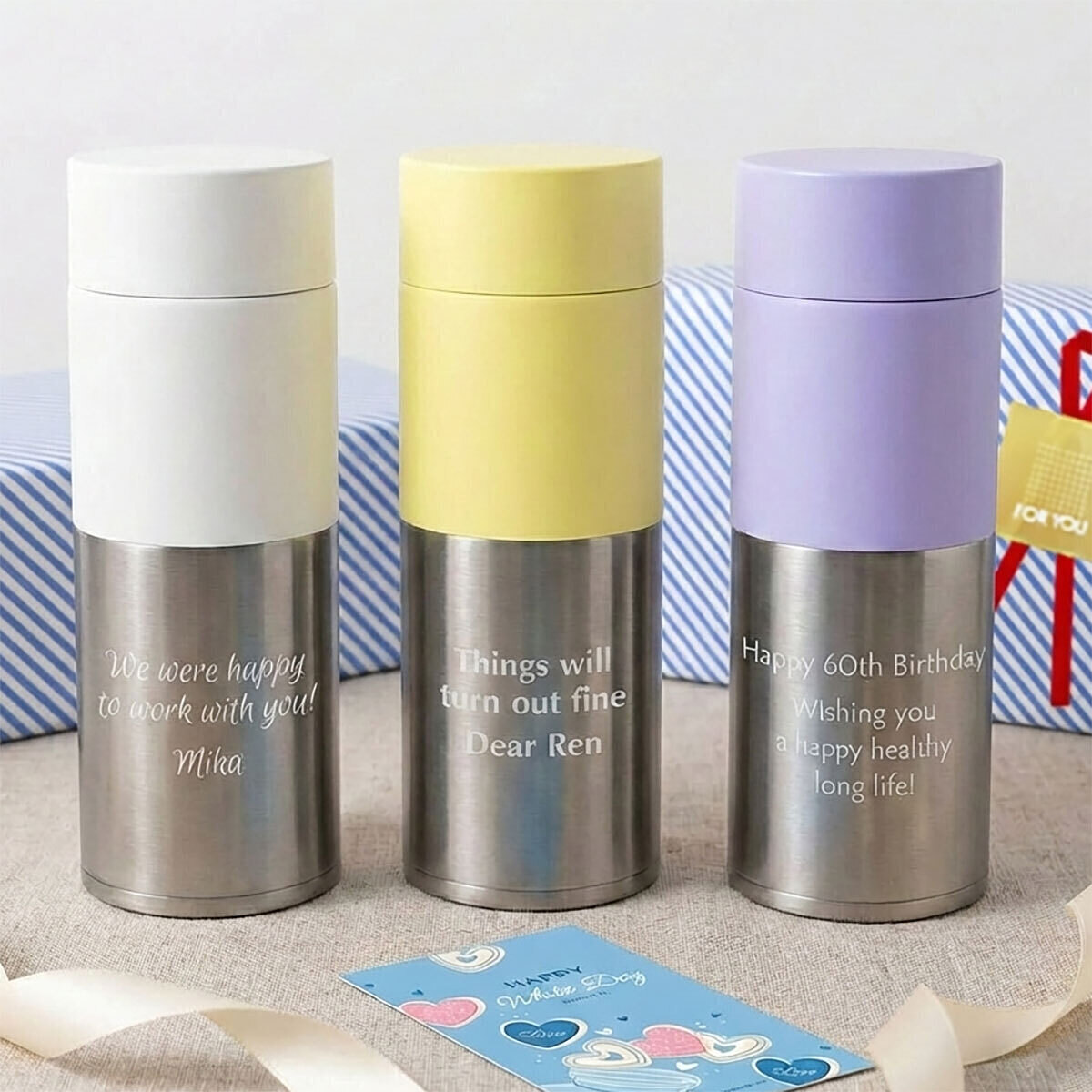 サイズ : 約 Φ65 x H173 mm 重量 : 約 250 g 容量 : 350 mL 材質 : ステンレス鋼, ABS樹脂, ポリプロピレン, シリコンゴム ボックス : 約 70 x 180 x 70 mm 保温効果 : 62度以上 (6時間) 保冷効果 : 8度以下 (6時間)