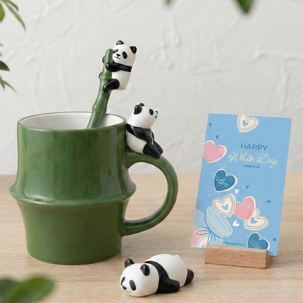 おっちょこちょいな白黒カラーの人気者、パンダのテーブルウェアが登場です。竹を模したマグにちょこんとパンダが。ころんと可愛いパンダと一緒にのほほんティータイム!実はパンダは木登り上手でスプーンの軸をするする~っと登ります。ごろごろ、ぐで~っと自由に過ごすパンダのポーズが箸置きになりました。マグカップ&スプーン&箸置きの3点セットです。