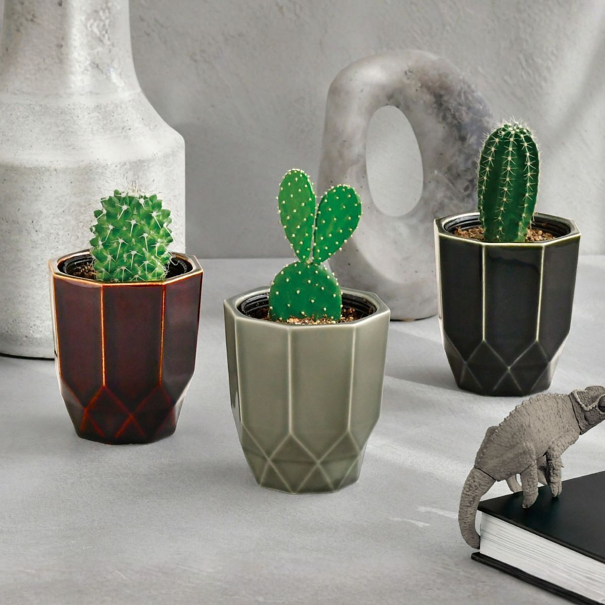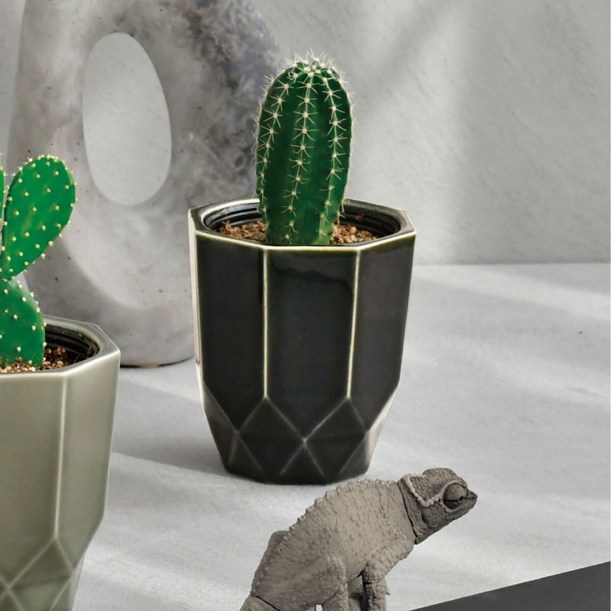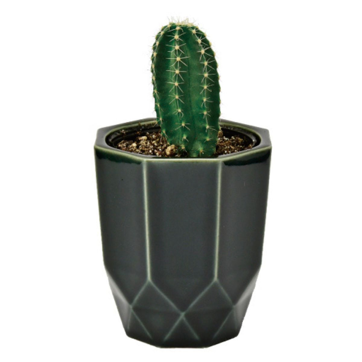 直線的なデザインがクールな八角形の陶器鉢でサボテンを育てます。 きりっとした鉢のフォルムと透明感のあるシックな色味は、落ち着いたインテリアにも馴染みます。 ユニークな姿へゆっくりじっくりと変化するサボテンは忙しい毎日を過ごす人に贈る、癒しのギフトとしてもおすすめ。