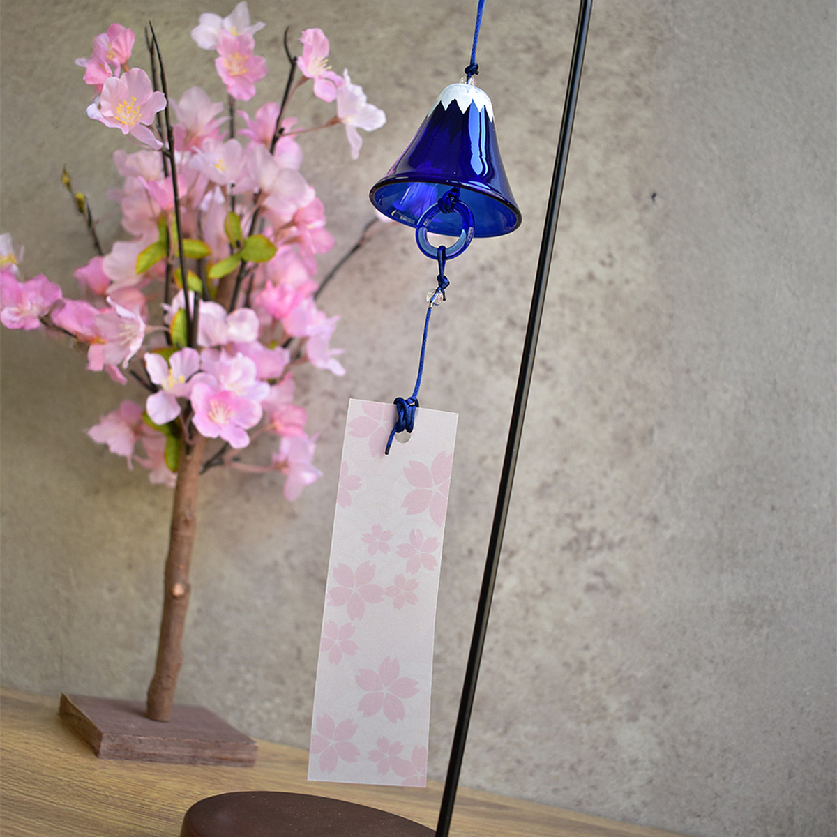 日本人に古くから愛される富士山をデザインした風の音を楽しむ日本の伝統的なインテリア「風鈴」。 短冊部分には桜の柄をあしらい、より一層日本を感じる縁起の良いデザインです。 チリンと奏でる軽やかな音色は、涼しげな空間を演出してくれます。