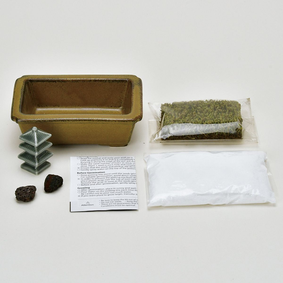 サイズ : 約 W108 x D72 x H52 mm 内容 : 角鉢, 三重塔, 石, スナゴケ, 化粧砂, 取扱説明書