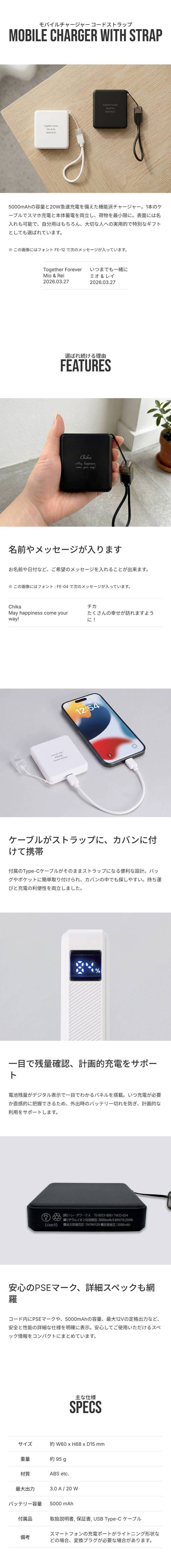 外出先での充電切れを救ってくれる便利なモバイルバッテリー。常にカバンに携帯したいものですよね。そんな予備バッテリーにはいつもそばに持っていて欲しいメッセージを入れてプレゼント。充電する機器と一緒に、あの人のハートも充電してあげられます。