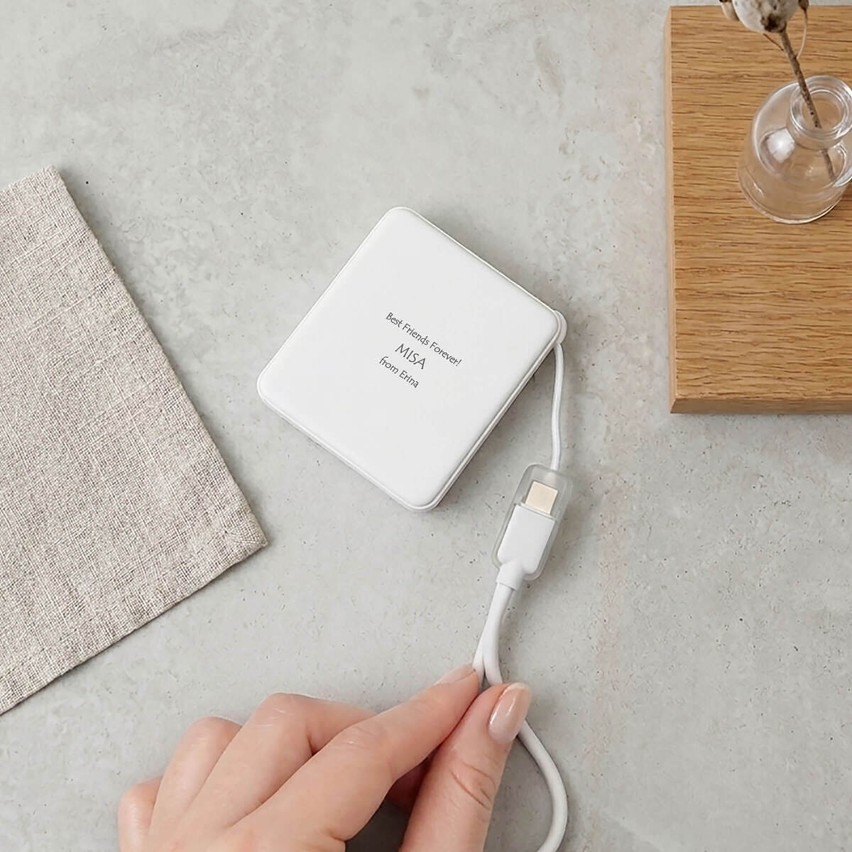 外出先での充電切れを救ってくれる便利なモバイルバッテリー。常にカバンに携帯したいものですよね。そんな予備バッテリーにはいつもそばに持っていて欲しいメッセージを入れてプレゼント。充電する機器と一緒に、あの人のハートも充電してあげられます。