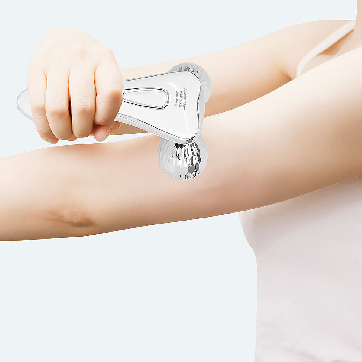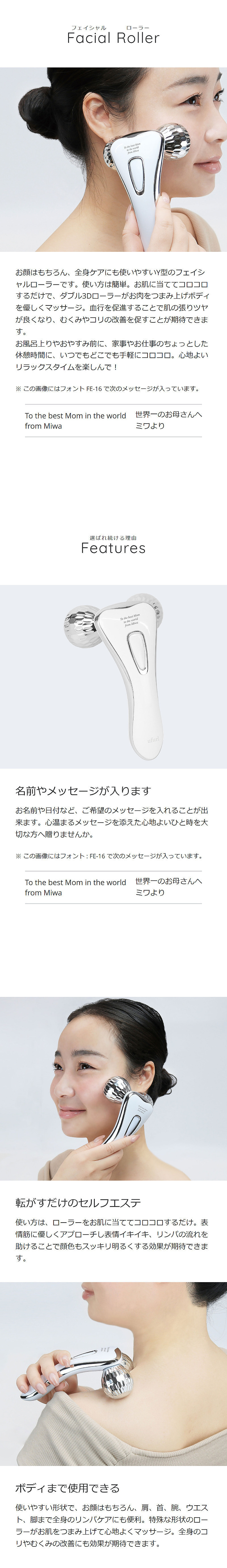 お顔まわりはもちろん、デコルテ、二の腕、お腹周り、脚まで全身ケアできるフェイシャルローラーです。ダブル3Dローラーがお肉をつまみ上げ、滑らかな動きで気になる箇所を心地よくマッサージします。
