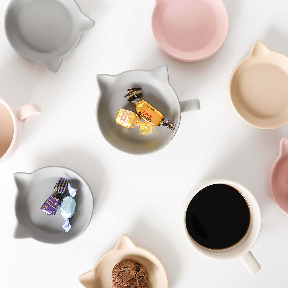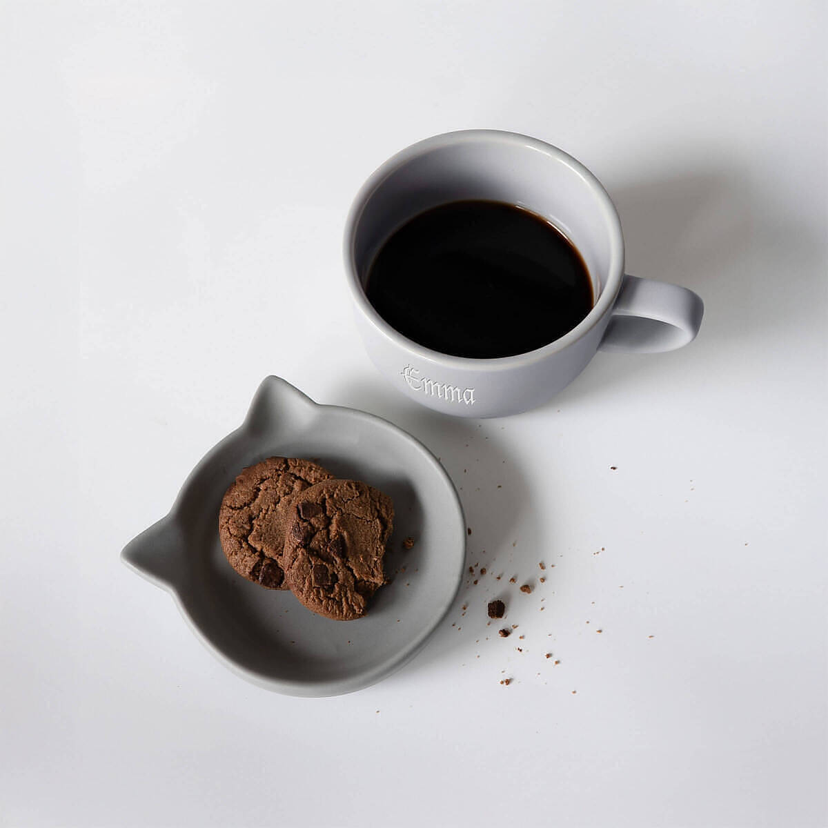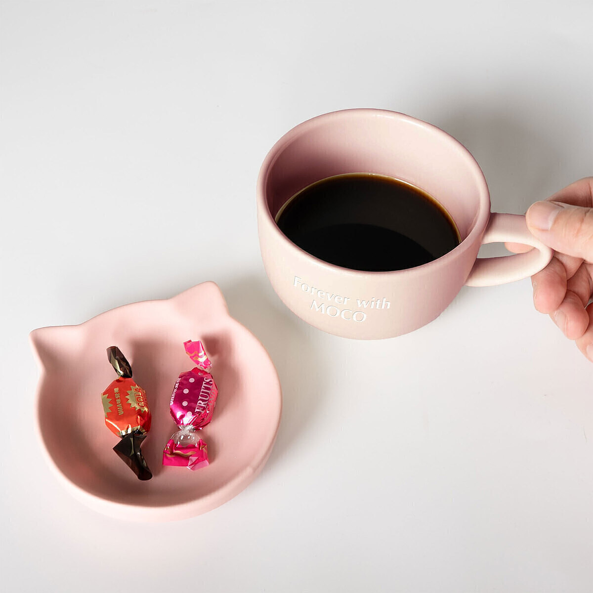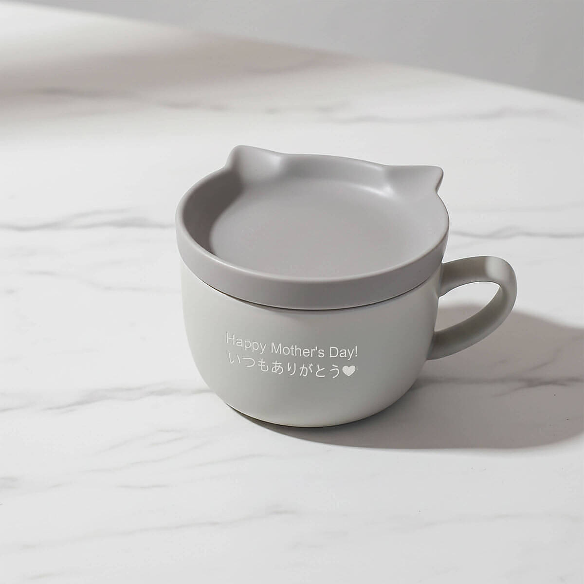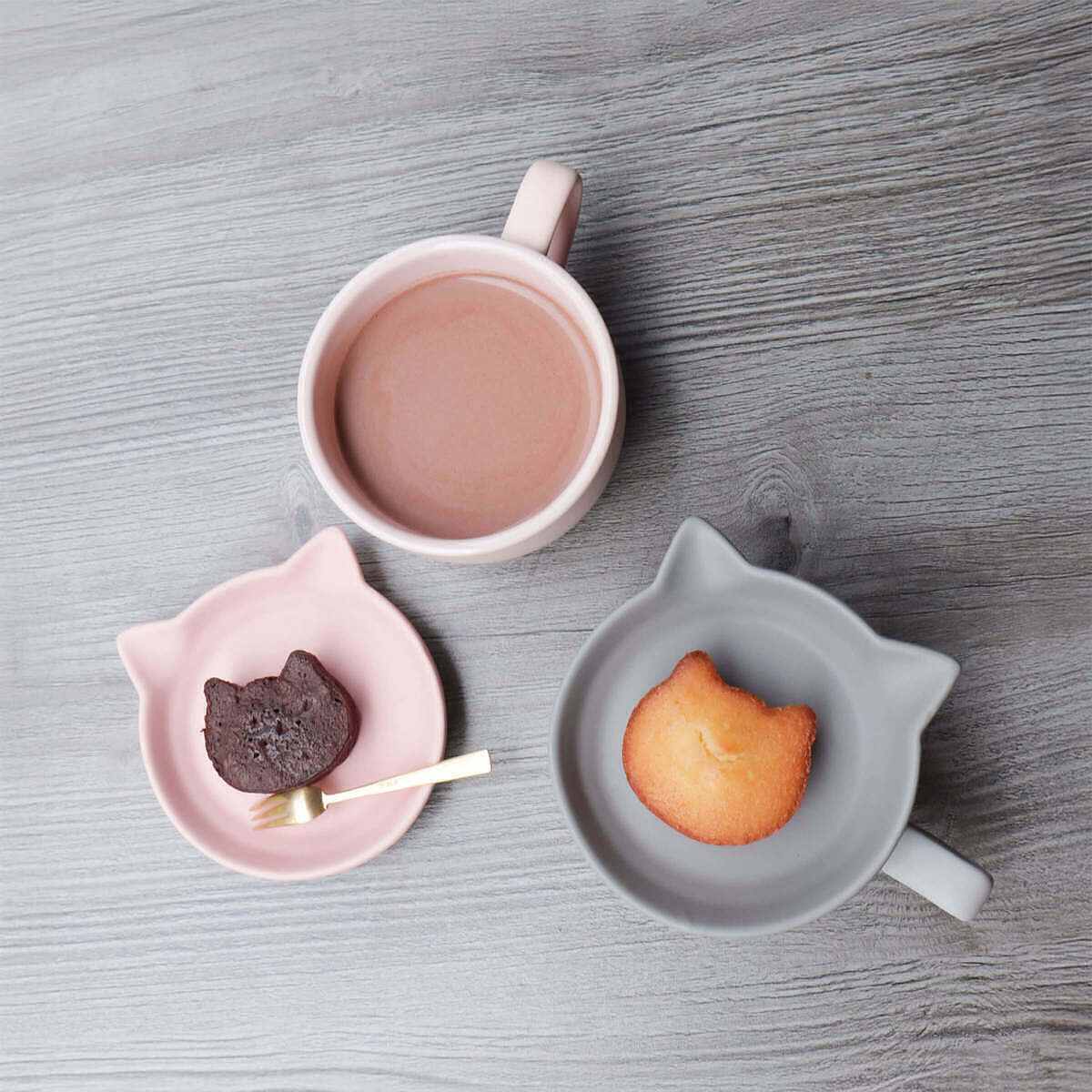 猫型小皿とマグカップの便利なセット。小皿はマグのフタとしても活用でき、保温やホコリ防止に役立ちます。温かみのある陶磁器製で、電子レンジや食洗機も使用可能です。
