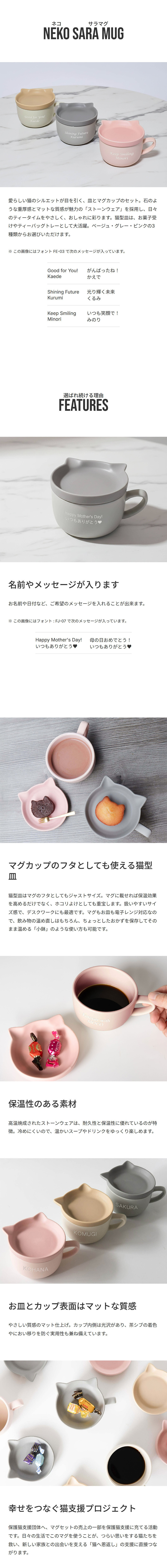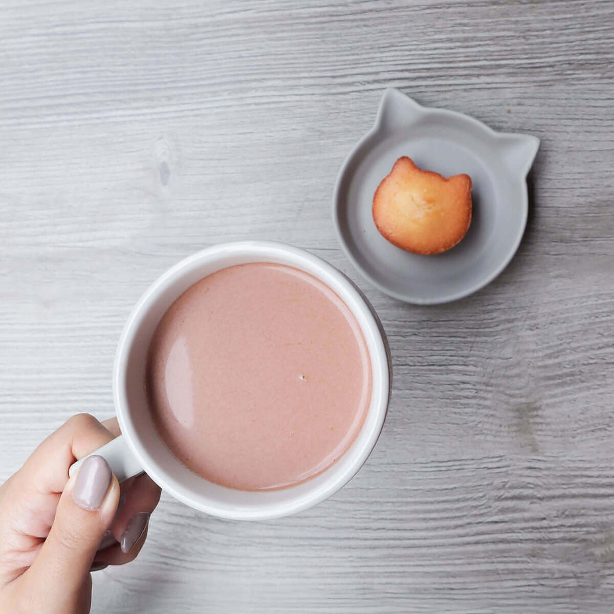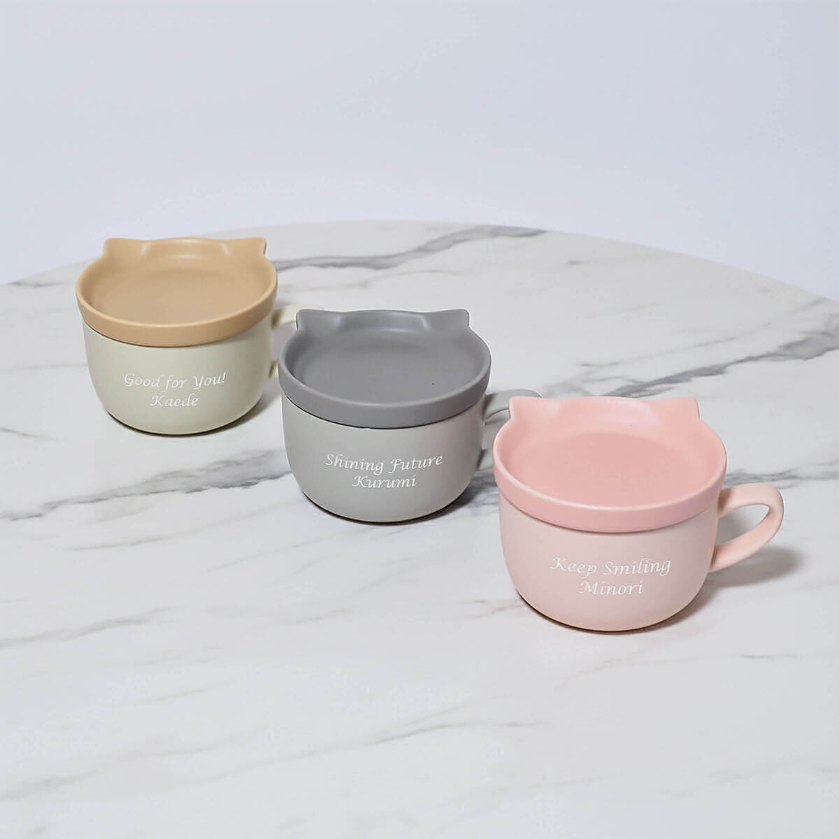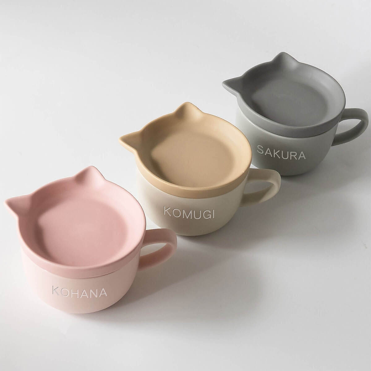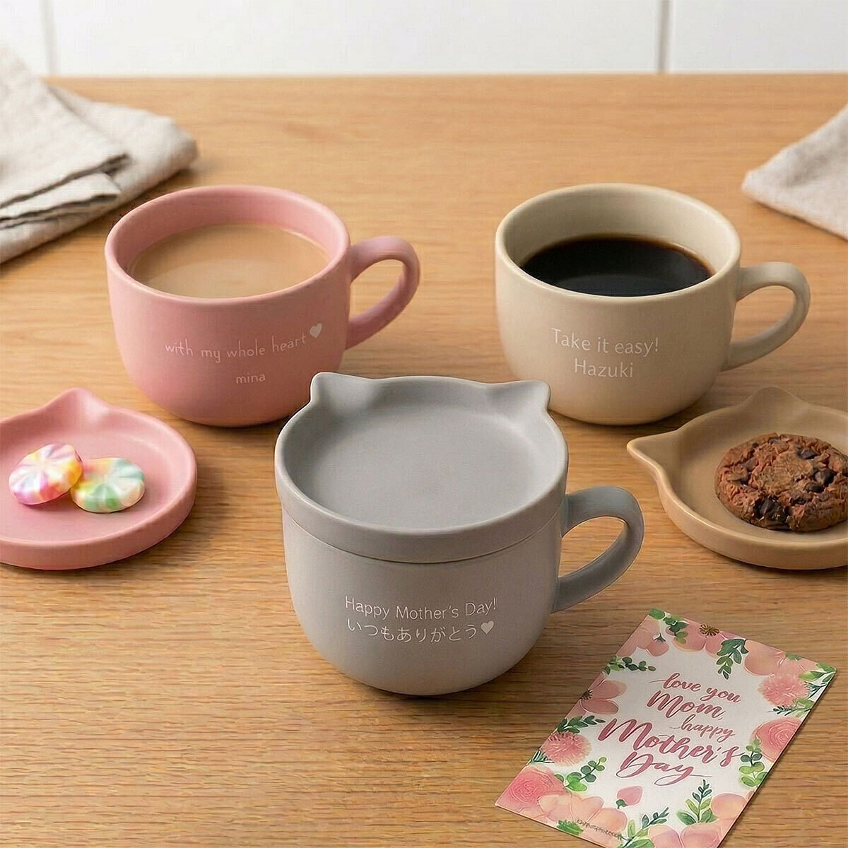 猫型小皿とマグカップの便利なセット。小皿はマグのフタとしても活用でき、保温やホコリ防止に役立ちます。温かみのある陶磁器製で、電子レンジや食洗機も使用可能です。