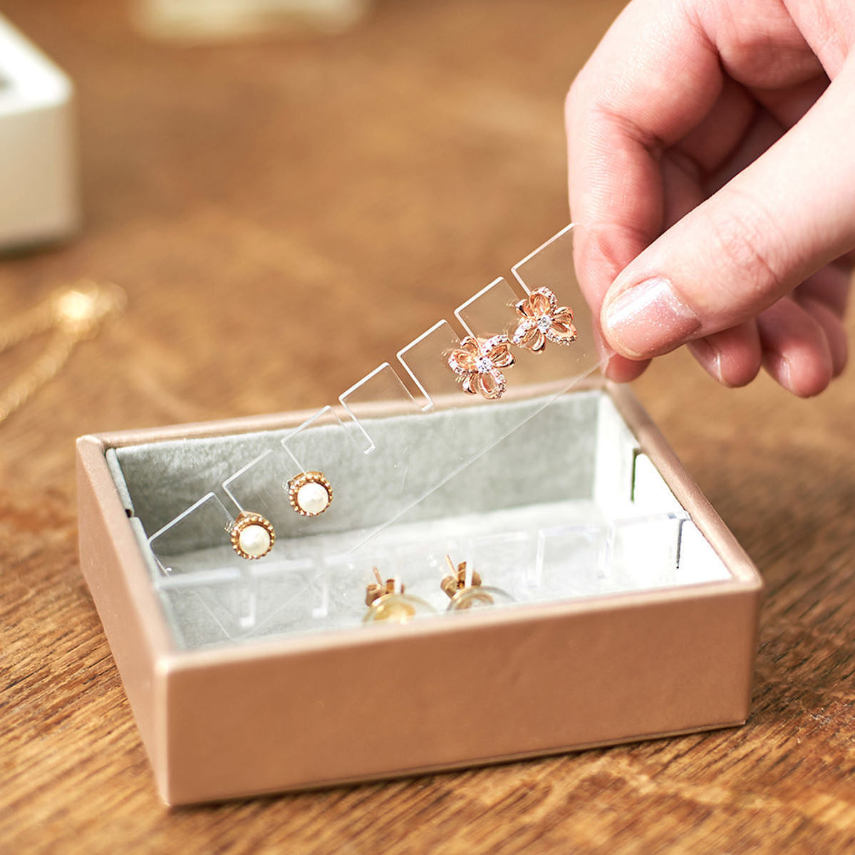 付属のリングトレーとイヤリング収納トレーは取り外しOK。収納アクセサリーに合わせて好きな位置に入れて使ったり、取り外して仕切りなしのフリーボックスとして使うこともできる自由度の高い収納ケースです。