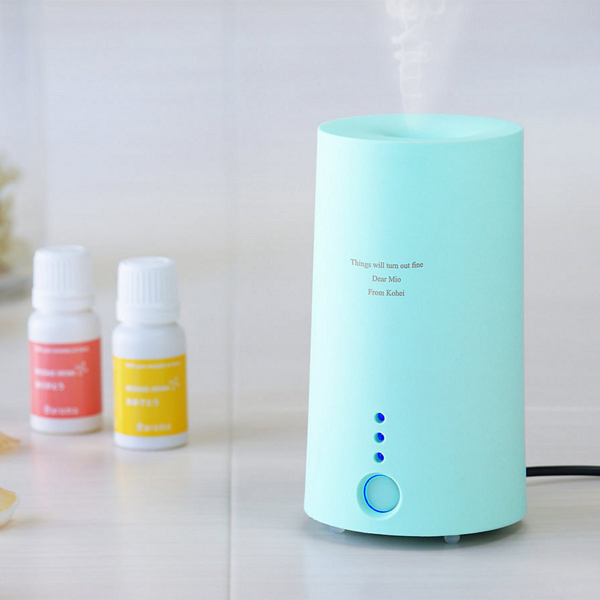 熱を加えない超音波方式で水とアロマオイルを霧状にし室内に広めるディフューザーで、オイル本来の香りを損なう事なく楽しめます。また、タイマーも付いているので就寝時も安心。コンパクトなサイズは場所をとらず、オフィスや自宅の玄関など様々な状況に適応できます。高級感のある質感はお部屋のインテリアにも最適。本体表面はマットフィニッシュ加工されており、PP(プラスチック)と思えない陶器のような、高級感あるシッカリした質感と優しいパステル調カラー仕上げになっています。