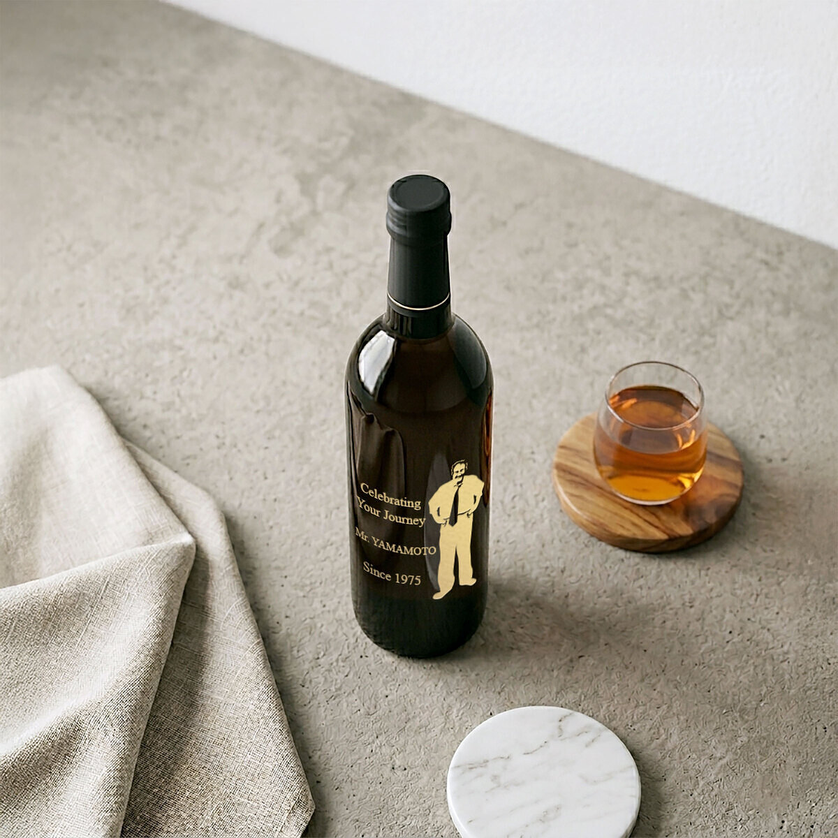 ワインや焼酎、日本酒などお酒のボトルにメッセージや名前・日付をレリーフして、記念に残るボトルを創りました。レリーフ部分はゴールド/シルバーのカラーリングで、さらにインパクトある仕上がり!