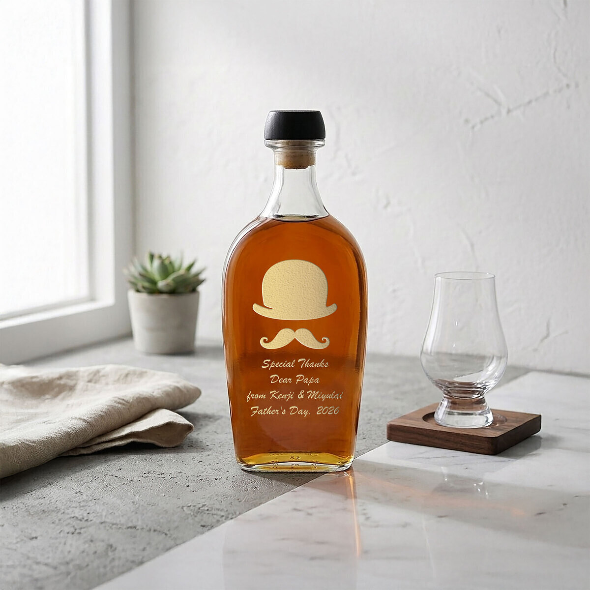 名前や日付・メッセージを入れたウィスキーは、センスあふれる特別なプレゼントになります。お揃いのフォントでメッセージを入れたグラスやウイスキーボトルを一緒に贈るのも GOOD!