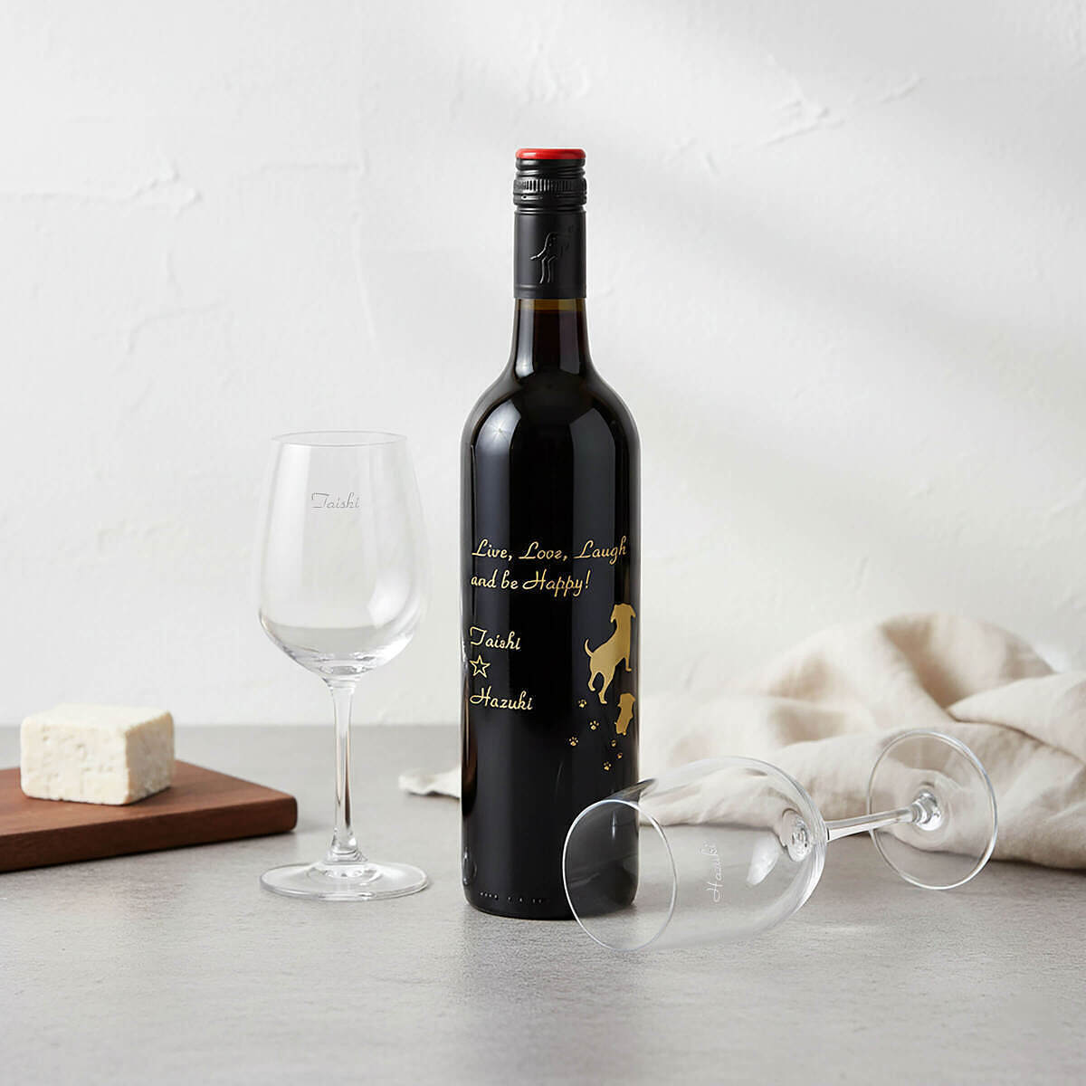 お揃いのフォントでメッセージを入れた名入れのワイングラスを一緒に贈るのも。