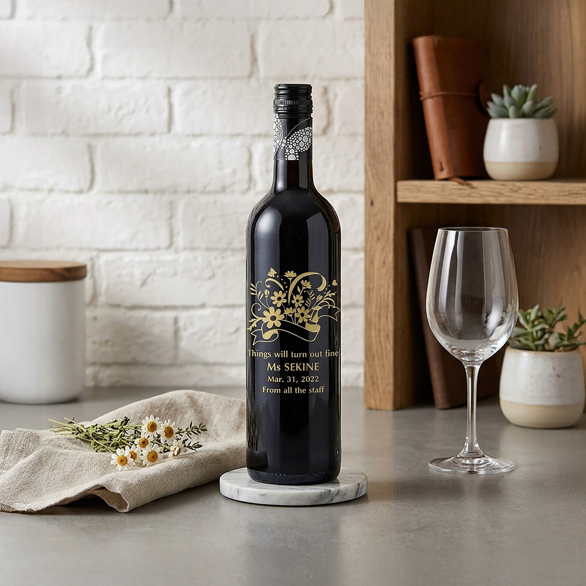 赤ワインの入ったボトルは黒っぽく見えるため、ゴールドのレリーフ (彫刻) が映えるメッセージワインになります。