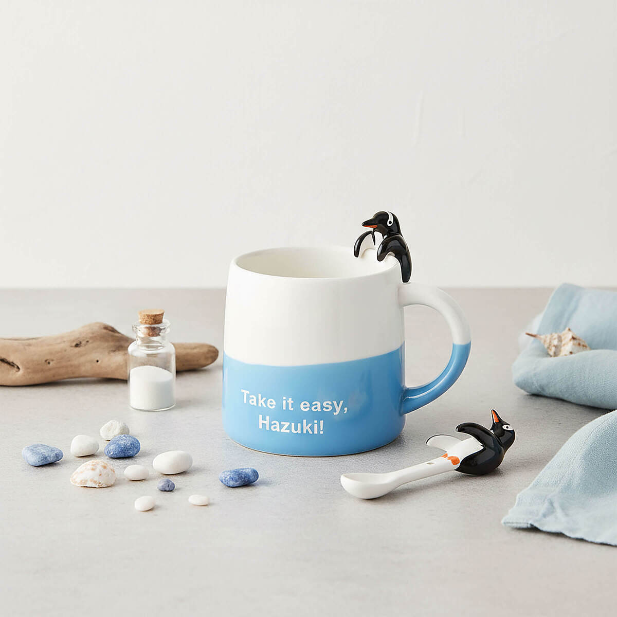 ペンギンがちょこんとついた可愛いマグカップと、陶器製のスプーンのセット。頭の白いカチューシャ模様がポイントのジェンツーペンギンはペンギン界の最速スイマーです。