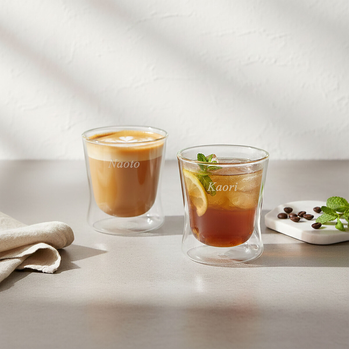 耐熱のガラスが二重構造に。熱い物を入れても、冷たい物を入れても持ったときに温度を感じにくく、ドリンクの温度変化もゆるやかです。見た目にはドリンクが浮いているように見えて普段使いにも、来客にももってこいの一品です。