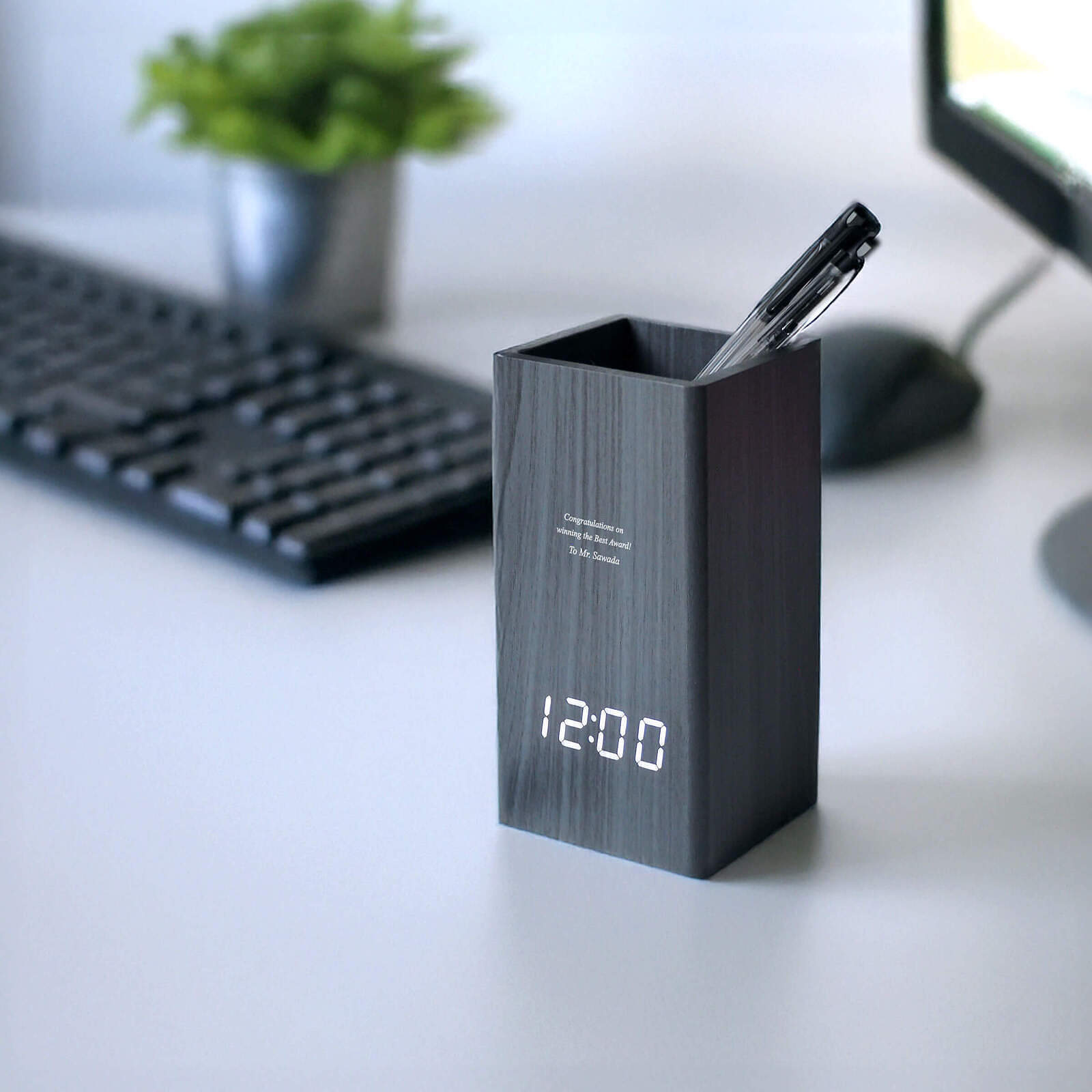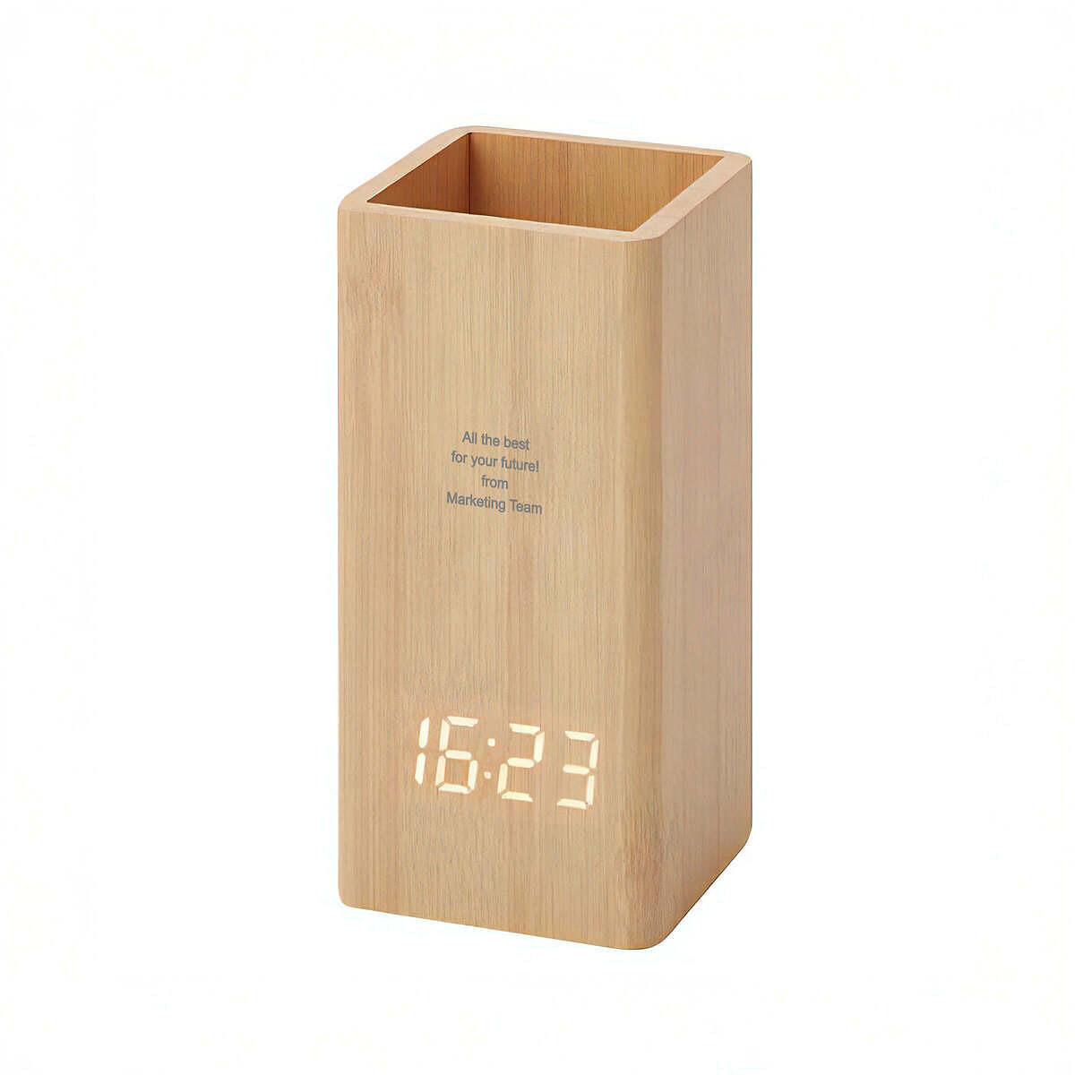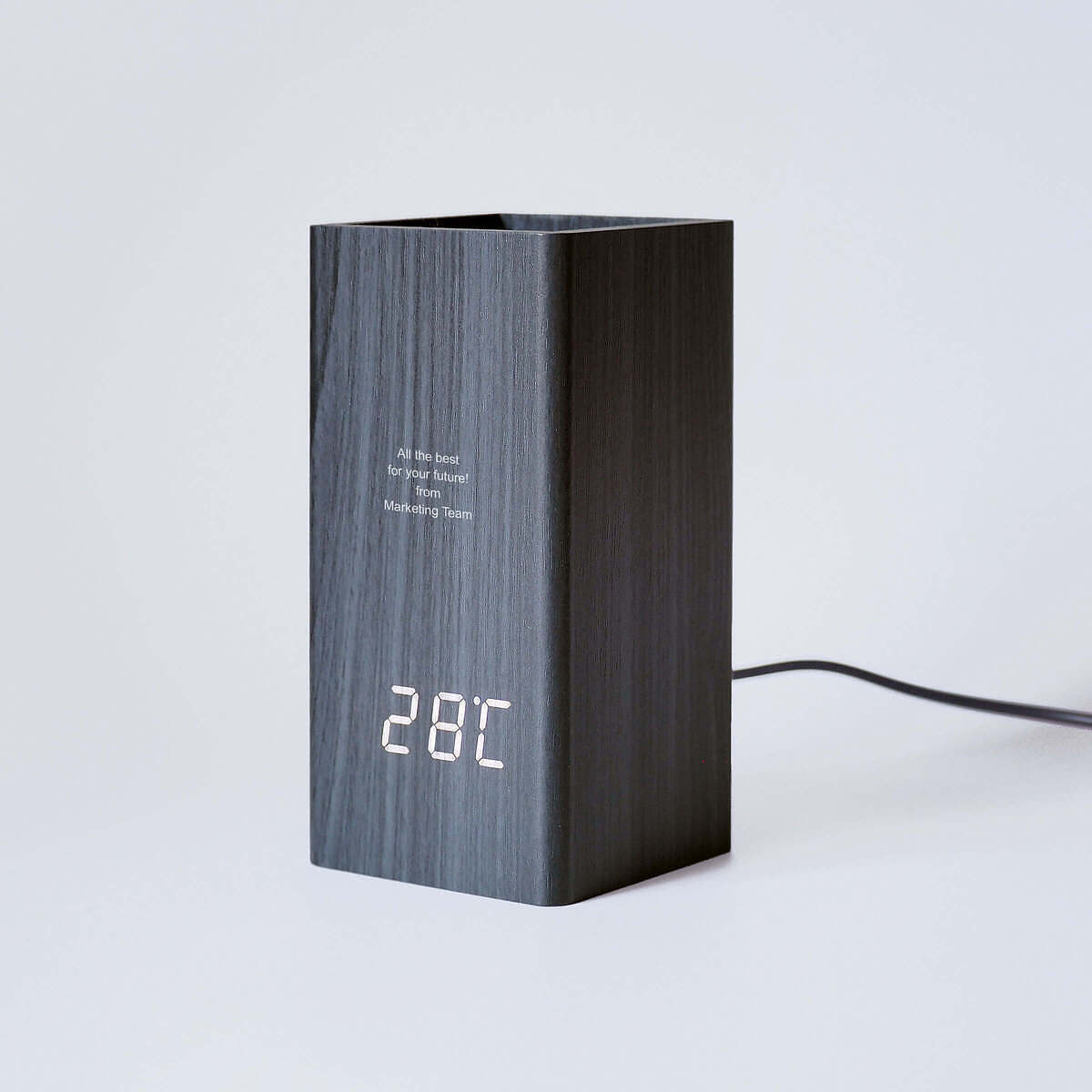 ペンスタンドと一体化して省スペースでデスクに設置できる、スタイリッシュな木製LEDクロック。時計のほか、カレンダーやアラーム、温度計の機能も備えるマルチさが魅力です。