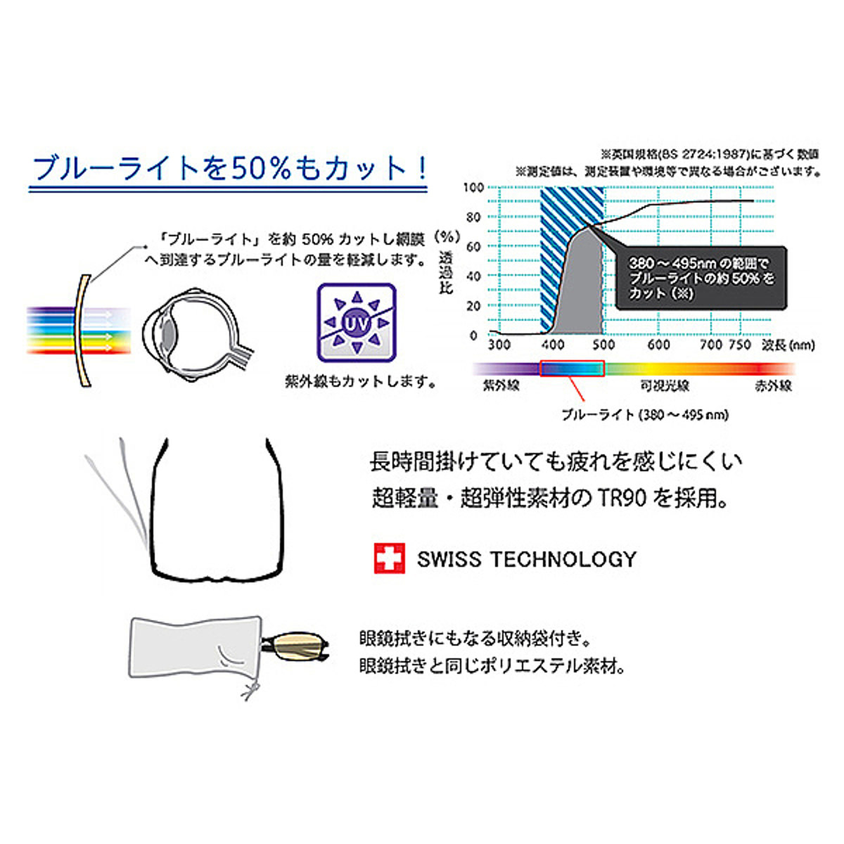 目の疲れやチラツキ、眼精疲労の原因となるブルーライトを約50%カットし、紫外線も99.9%以上カットするので、野外でサングラスとしても利用可能です。