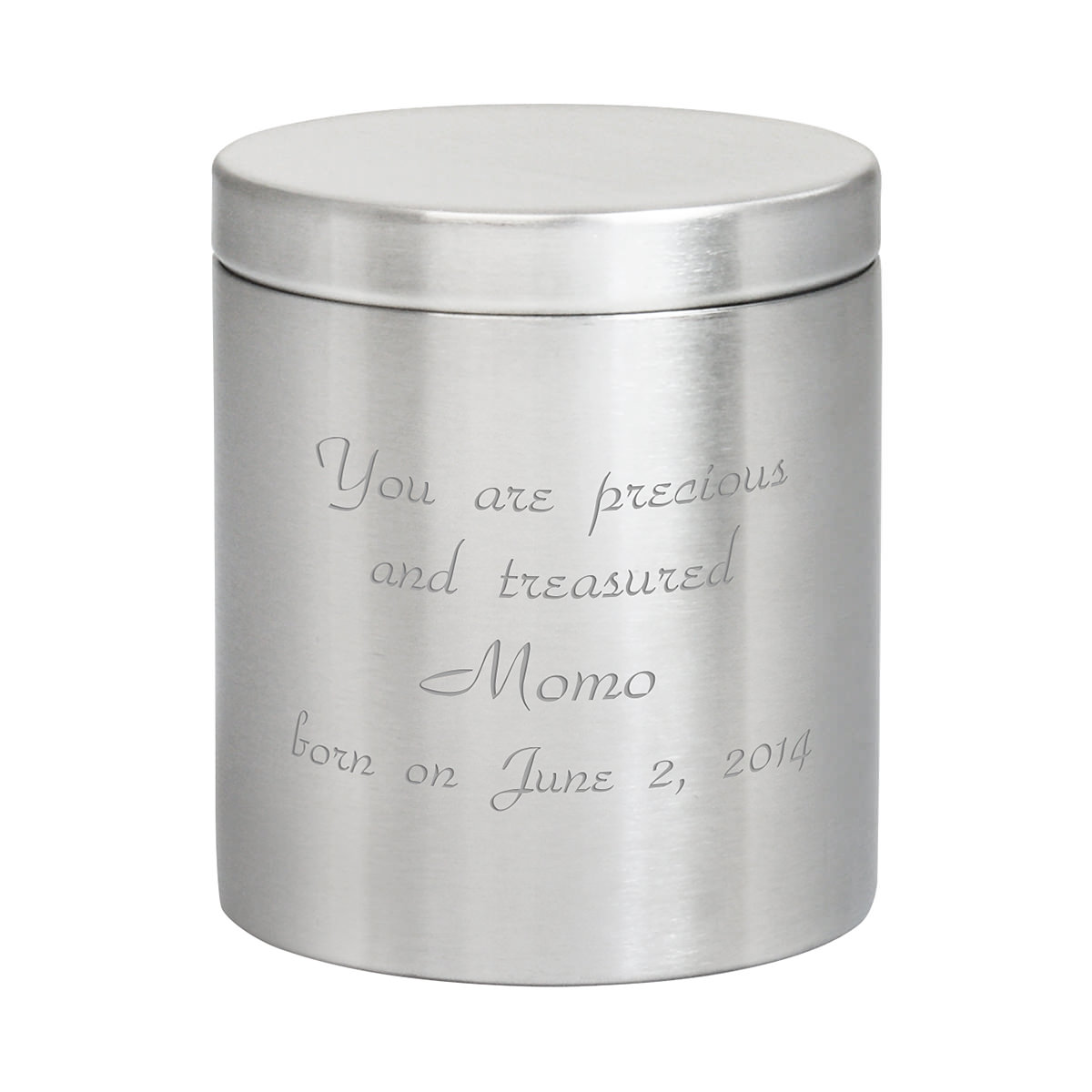 スッキリシンプルなステンレスのフタつき小物入れです。爪楊枝入れサイズの S です。シンプルな容器だからメッセージ次第で色々なオリジナルボックスに変身します。