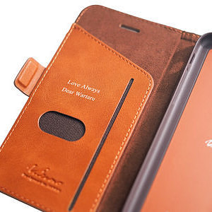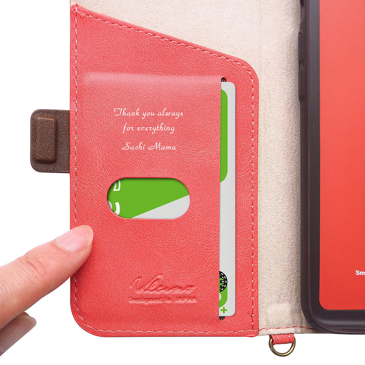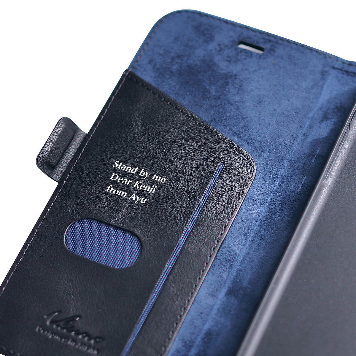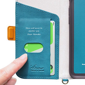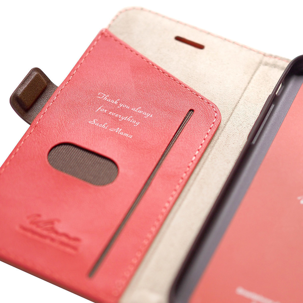 フラップの内側、カードホールの上約 25 x 25 mm 内にご希望のメッセージが入ります。スマホを使う前にはメッセージを見て笑顔になっていただきましょう。