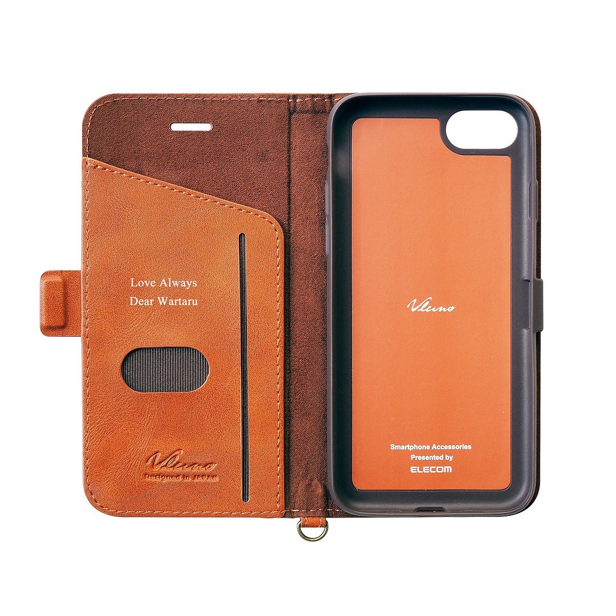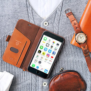 横開きの手帳型 iPhone ソフトレザーカバーです。iPhone 8、iPhone 7 にご使用いただけます。SUICA や PASMO、ICOCA、TOICA などの IC カード入れが付いているので、通勤通学にとっても便利です。フラップを固定できる磁石、ストラップリングやカードホルダー付き。また、スタンドもできて必要な機能がしっかり備わっています。