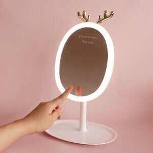 自然光に近い LED ライトが付いたスタンドミラーです。スタンド部分はトレイになっていて、メイク道具やアクセサリーを置けます。ミラーの面を天井に向けると、間接照明としても使えます。