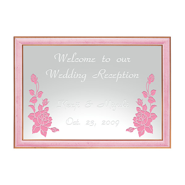 ミラーに、表からメッセージやお名前・日付を、裏からはフレームデザインをレリーフした、ハイグレードな仕上がりのウェルカムボードです。2サイズ x 4カラー x 8デザイン = 64通り の中からお選びください。