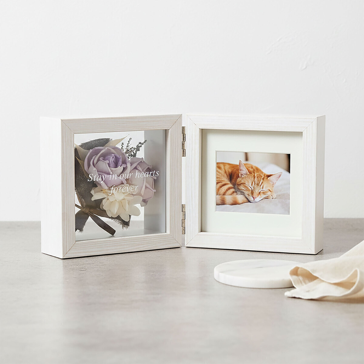 名前やメッセージ、日付入りのフォトフレームはペット友達へのプレゼントにも人気です。大切なペットを失って沈みがちな友人が笑顔が戻りますように。