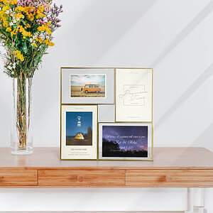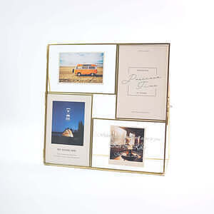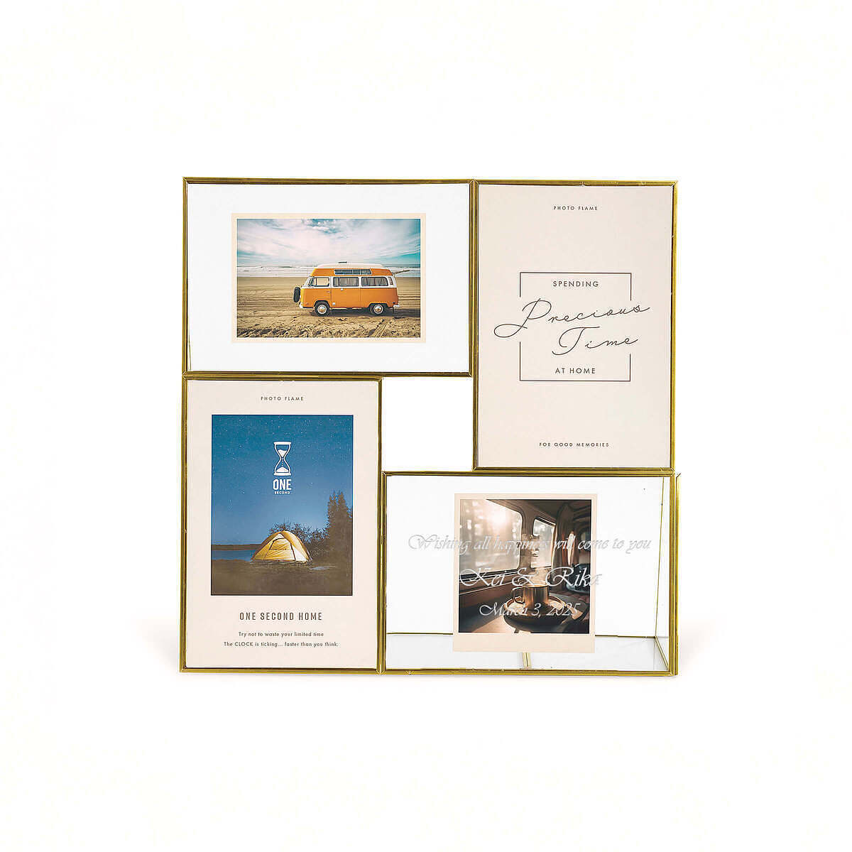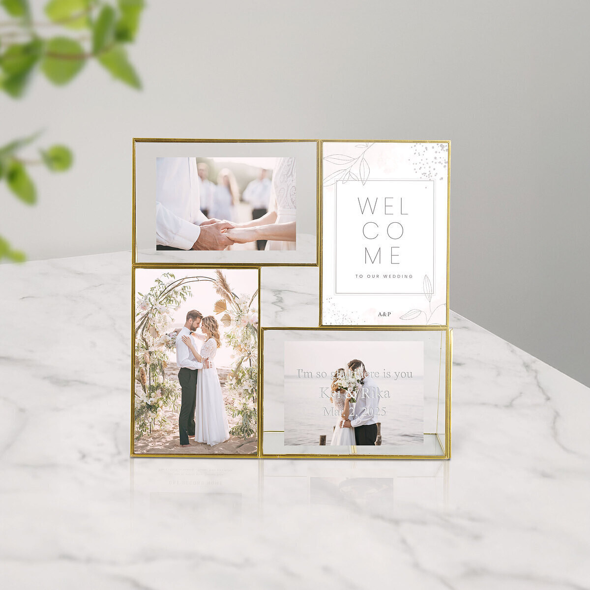 細いゴールドのフレームが上品な4面のフォトフレーム。ウェルカムボードとして受付に飾れば、ゲストの目を引くこと間違いなしです。他にも大きな写真が入るタイプ、プリザーブドフラワーの装飾付きなど、色々な種類を揃えました。