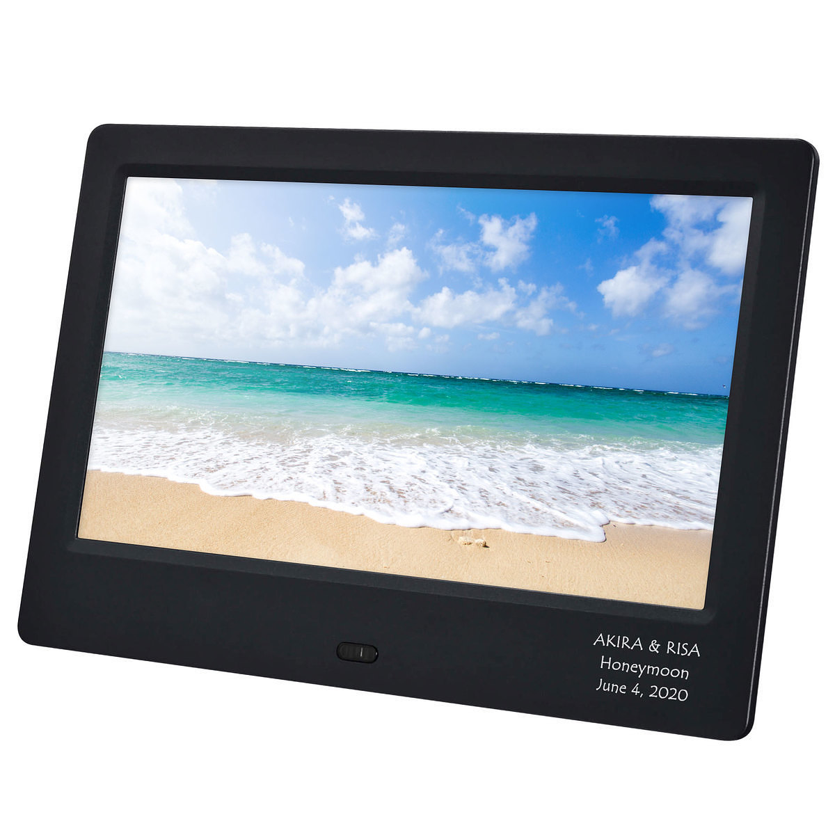二人の名前と結婚記念日を入れたデジタルフォトフレーム。新居でもバッチリ使えます。また、何人かのお友達が出し合って贈る結婚祝いとしても一緒に贈るプレゼントとしても人気です。