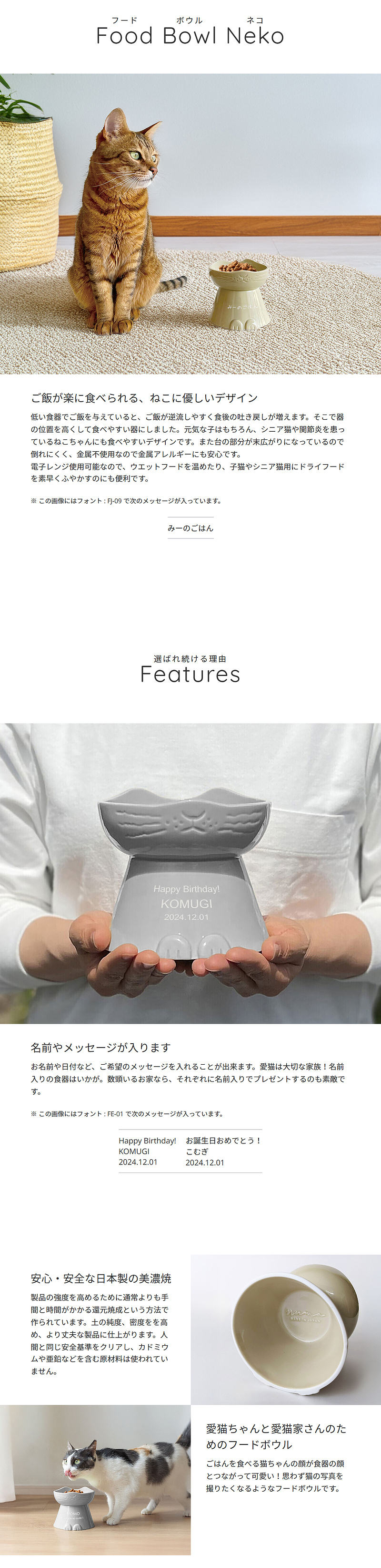 食べやすさ、安全性、使いやすさ等、猫ちゃんのことを一番に考えたこだわりのつまった食器です。「インテリアに馴染む」「リアルなネコの色」を追求した特別な2カラーです。電子レンジ、食洗器対応。安心・安全な日本製です。
