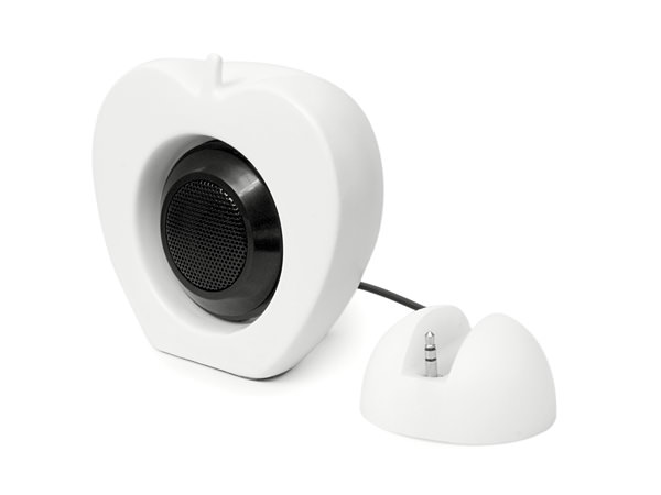 リンゴをスパンと半分に切った形の…置物?正体はスピーカーです!パッシブ型スピーカーだから電源不要。お手持ちのミュージックプレイヤーにつなぐだけで、気軽にどこでも音楽を楽しめます♪