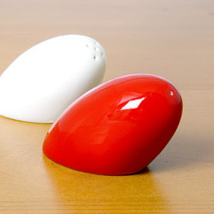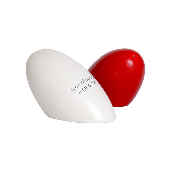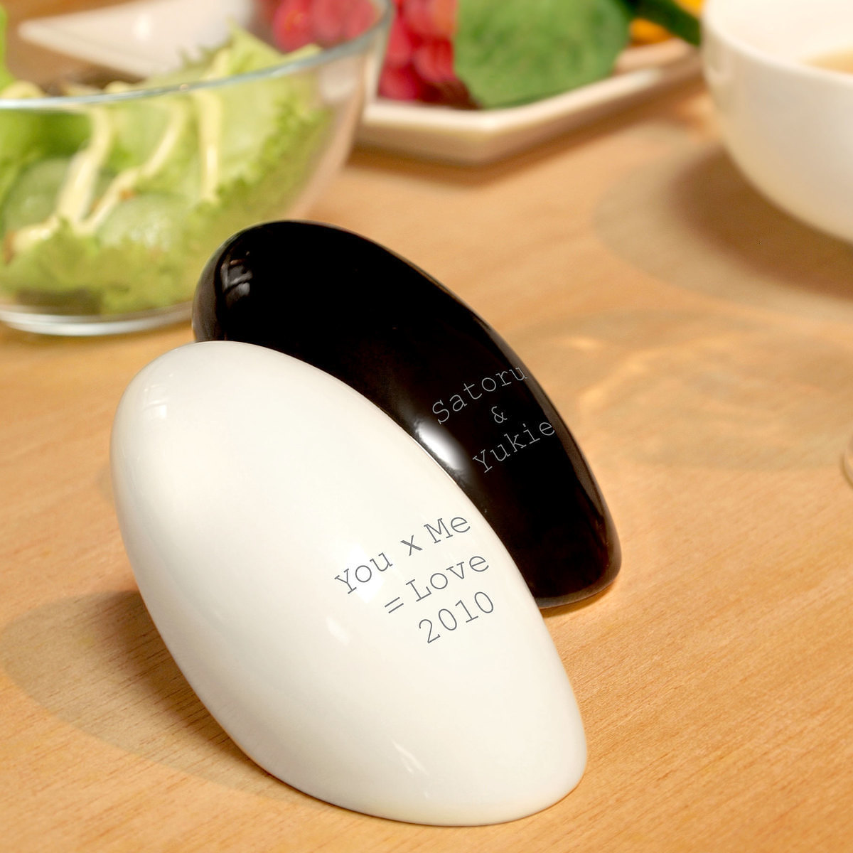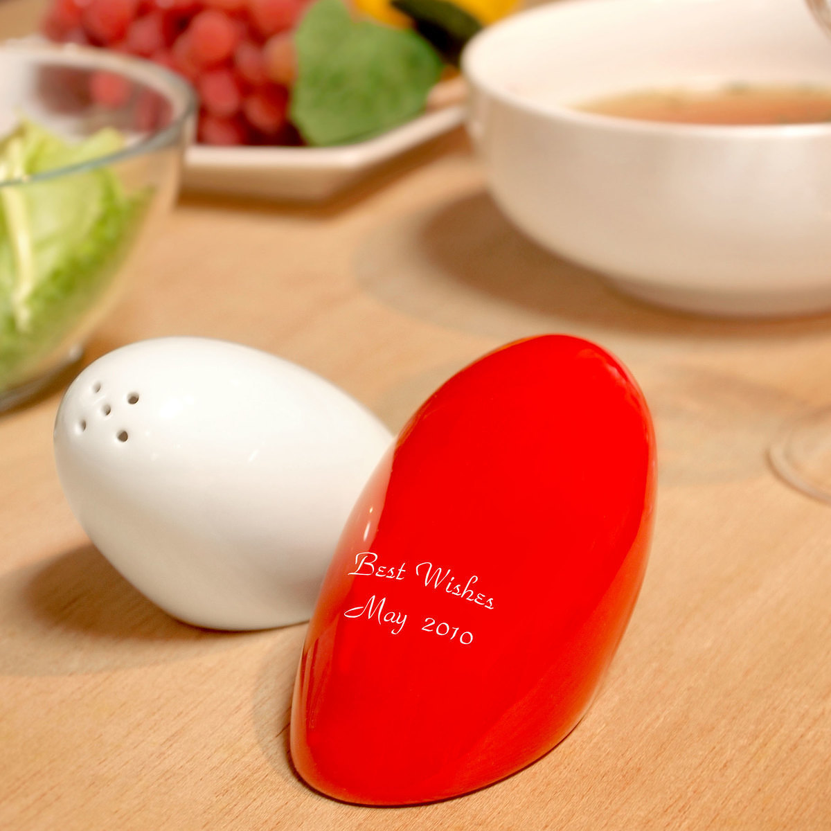 オブジェとしてもカワイイ、ユニークな形の塩こしょう入れ。新婚のふたりの食卓にぴったりの結婚祝いに。ご希望のメッセージをプリントできるので、もちろんふたりの名前を入れて贈ってあげてください。