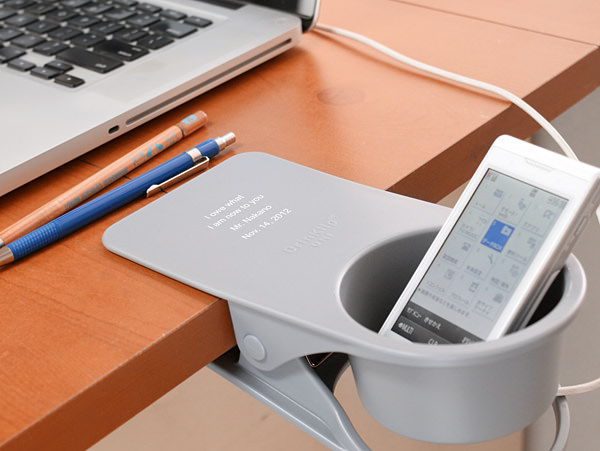デスク、棚、イスのひじ掛けなどにクリップをはさむだけでドリンク&モバイルスタンドが簡単に!700 g まで OK の強力クリップです。オフィスや書斎などデスク周りに、便利でオシャレなアイテムです。底には穴から充電ケーブルを通して携帯やスマートフォンの充電時にも便利です。アイデア次第で多目的に利用できます。